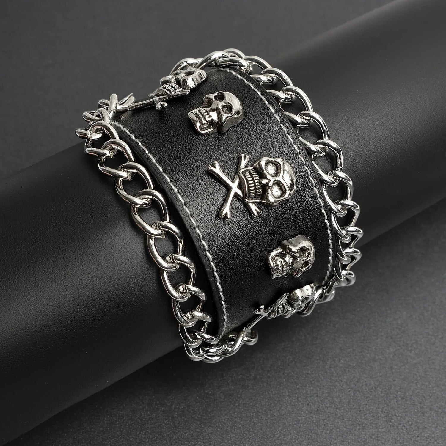Make a bold statement with this edgy skull and crossbones leather bracelet. Crafted with high-quality black leather and accented with detailed silver-tone skulls and chains, this piece is perfect for those who embrace a rebellious style.